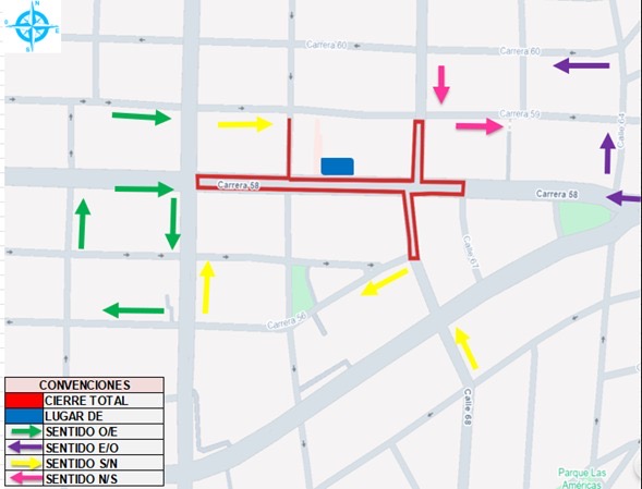 Los conductores que transiten por la calle 70 deben tomar la carrera 59 hasta la calle 59. Los conductores que transiten por la calle 68 sentido norte-sur deben tomar la carrera 59 hasta la calle 59.