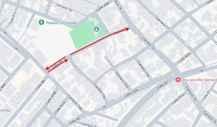 La calle 84, entre las carreras 75C y 76, pasa de doble a un único sentido de circulación vial sur – norte (del barrio Villa Carolina hacia la Vía 40).