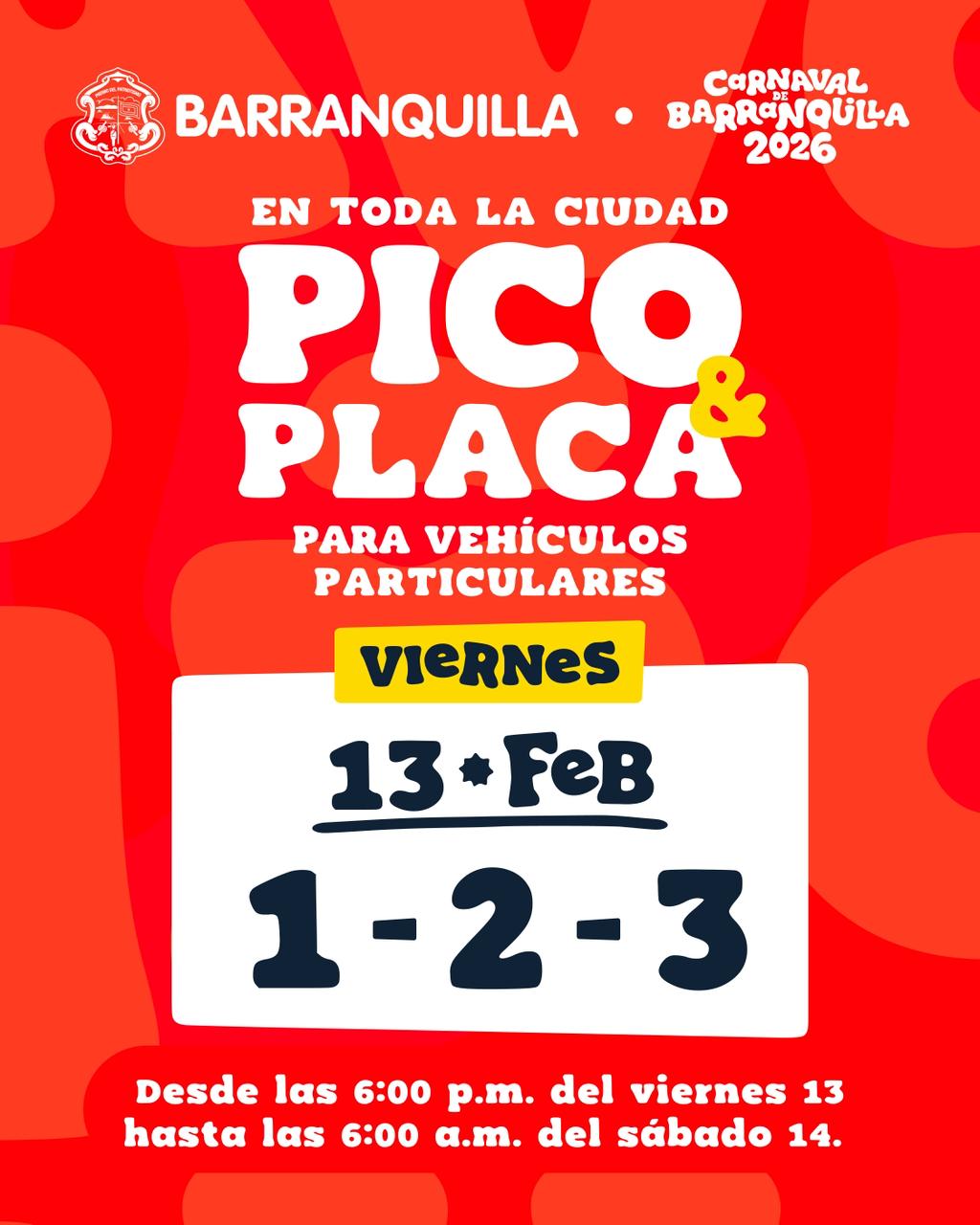 Barranquilla está lista para celebrar el Carnaval,por tal motivo, la Alcaldía de Barranquilla, a través de la Secretaría de Tránsito y Seguridad Vial implementa el pico y placa en toda la ciudad desde el viernes 13 de febrero hasta el lunes 16 de febrero, teniendo en cuenta el último dígito del número de placa: